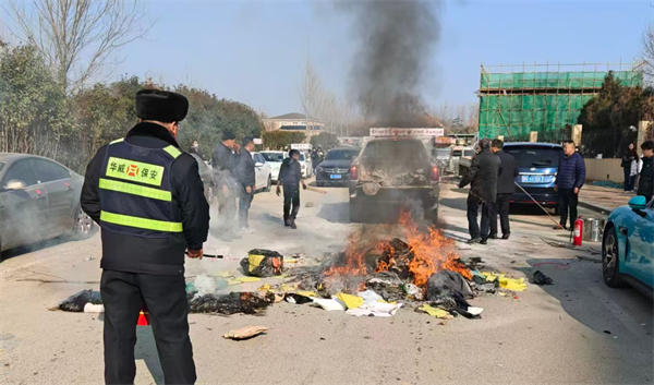 2025年12月30日上午10点左右,华威保安驻日照某大学项目西门外,一辆皮卡车行驶至西门北50米处时,车厢衣物突然冒烟起火。当时正值上课时段,西门路边停满电动自行车,火势一旦蔓延后果不堪设想。