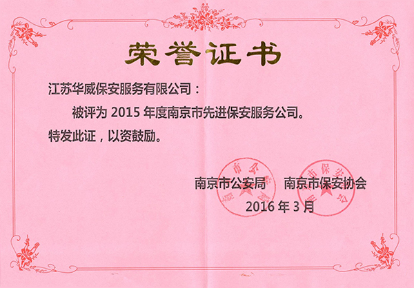 3月31日,南京市2015年度先进保安服务公司颁奖活动隆重举行。江苏华威保安服务公司成为受表彰的先进企业之一。