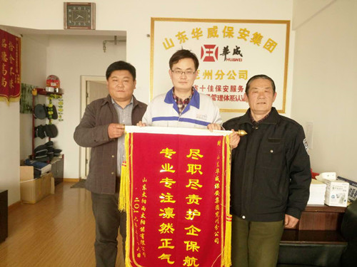 3月25日,太阳雨太阳能有限公司客户领导,将一面绣有“尽职尽责护企保航,专业专注凛然正气”字样的锦旗送到兖州分公司,以此表达对兖州分公司的感谢之情。