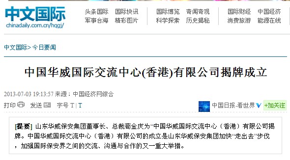 人民网、新浪网、凤凰网等二十余家媒体报道中国华威国际交流中心(香港)有限公司揭牌成立