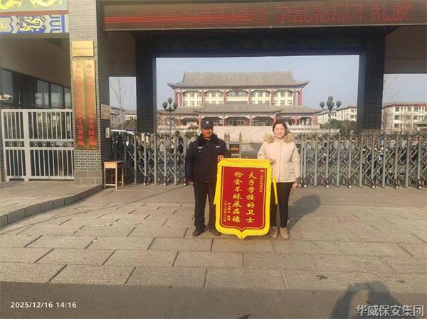 2025年12月16日,一面写有“夫子学校好卫士,拾金不昧展品德”的锦旗被送到了夫子学校,送旗人是该校初中部一名学生的家长,以此感谢华威保安曲阜分公司夫子学校项目部队员...